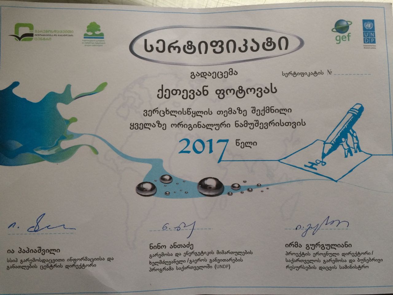 At the conference, in which 16 students from different universities of Georgia were involved, 3 of them became the winner. Among them was Iakob Gogebashvili Telavi State University II course student of the Biology Bachelor Educational Program, faculty of Exact and Natural Sciences – Ketevan Photova (supervisor – Associate Professor Giuli Andronikashvili). She was awarded the certificate and appliance store coupon (300 GEL) for the most original work done around the topic – mercury.
