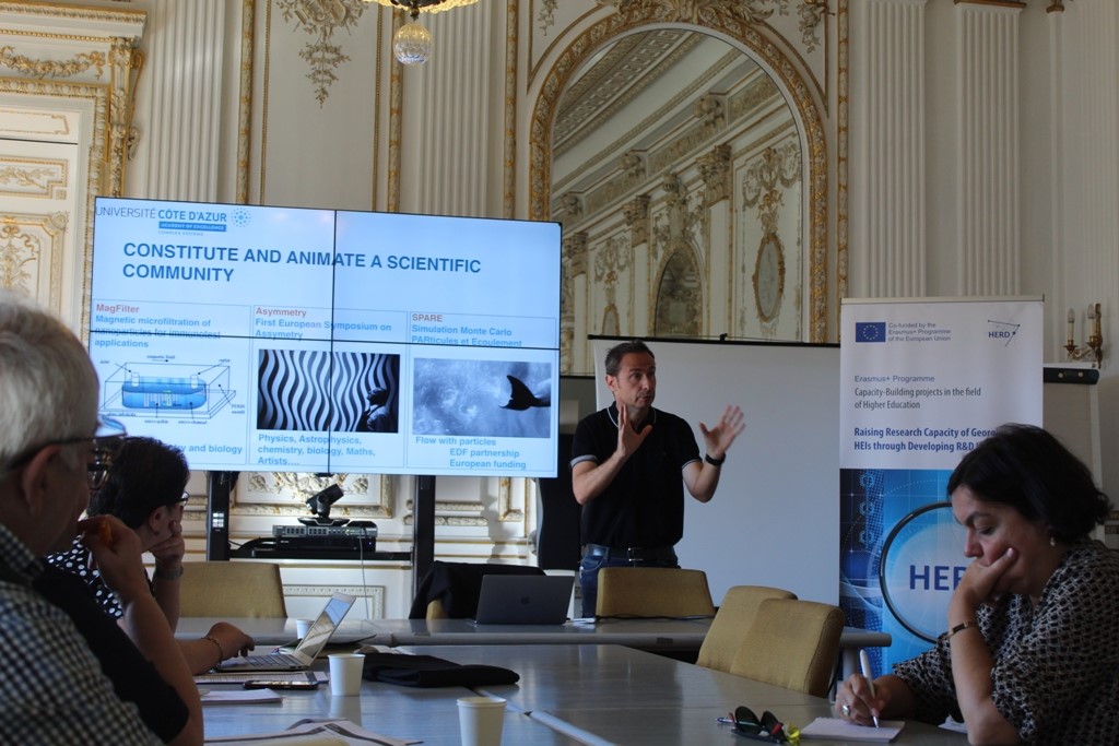 Following the training on R&D strategy delivered in Batumi (Georgia) last June by UNS/Université Côte d'Azur staff involved in research management at steering level and at support level, Université Côte d'Azur welcomed representatives of Georgian universities and research institutions in the framework of the HERD project (Erasmus + programme) in Nice for the week of October 7-11, 2019. The main goal of the study visit was to better understand the R&D strategy of Université Côte d'Azur. The agenda included detailed presentations, visits to various university sites and laboratories, and individual meetings in order to develop stronger ties of cooperation between France and Georgia. The different departments of Université Côte d'Azur have mobilized in order to prepare an intense and comprehensive program meant to give our counterparts a vision of UNS organization, its structuring program s, projects and actors in research and innovation.