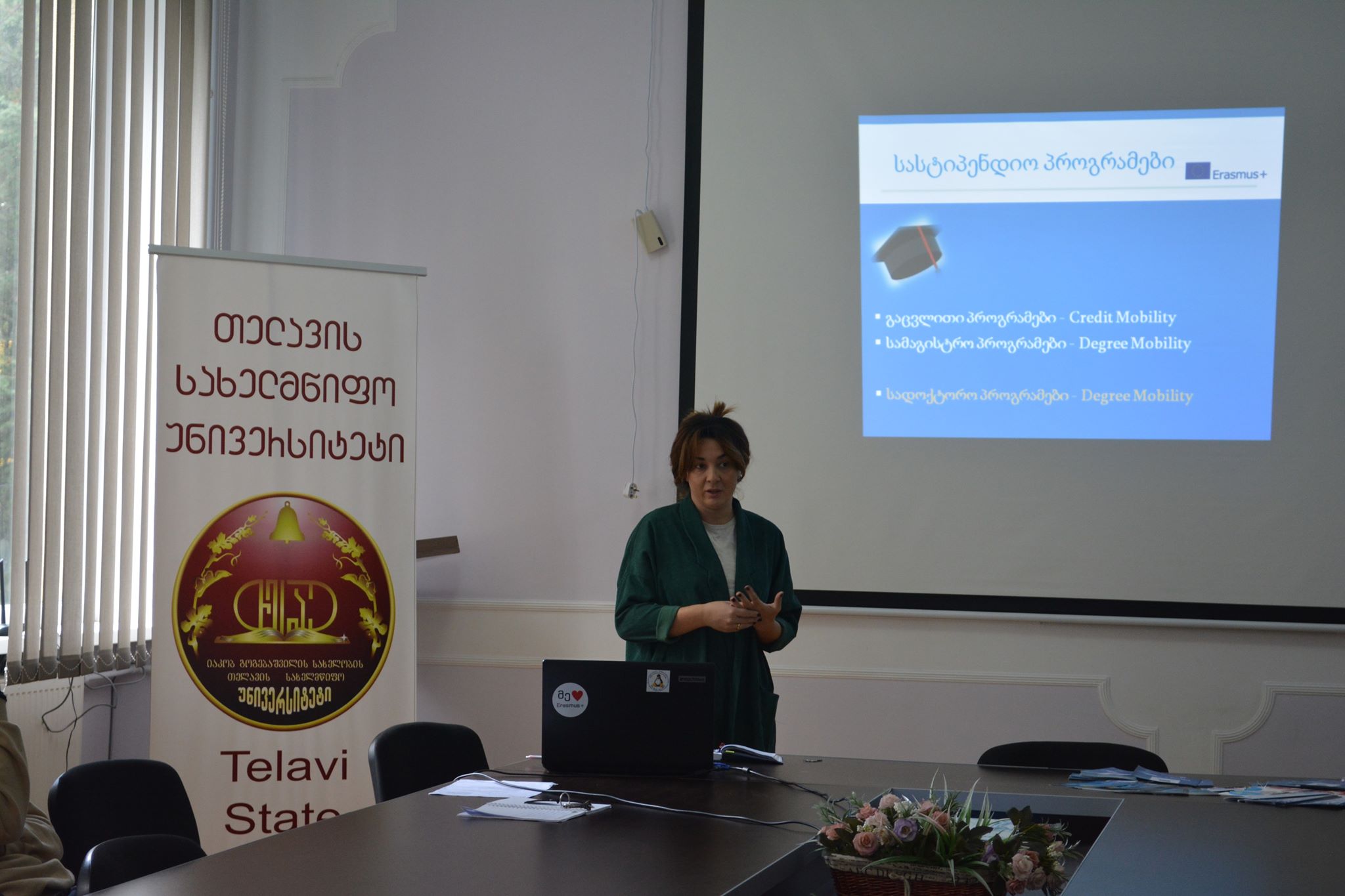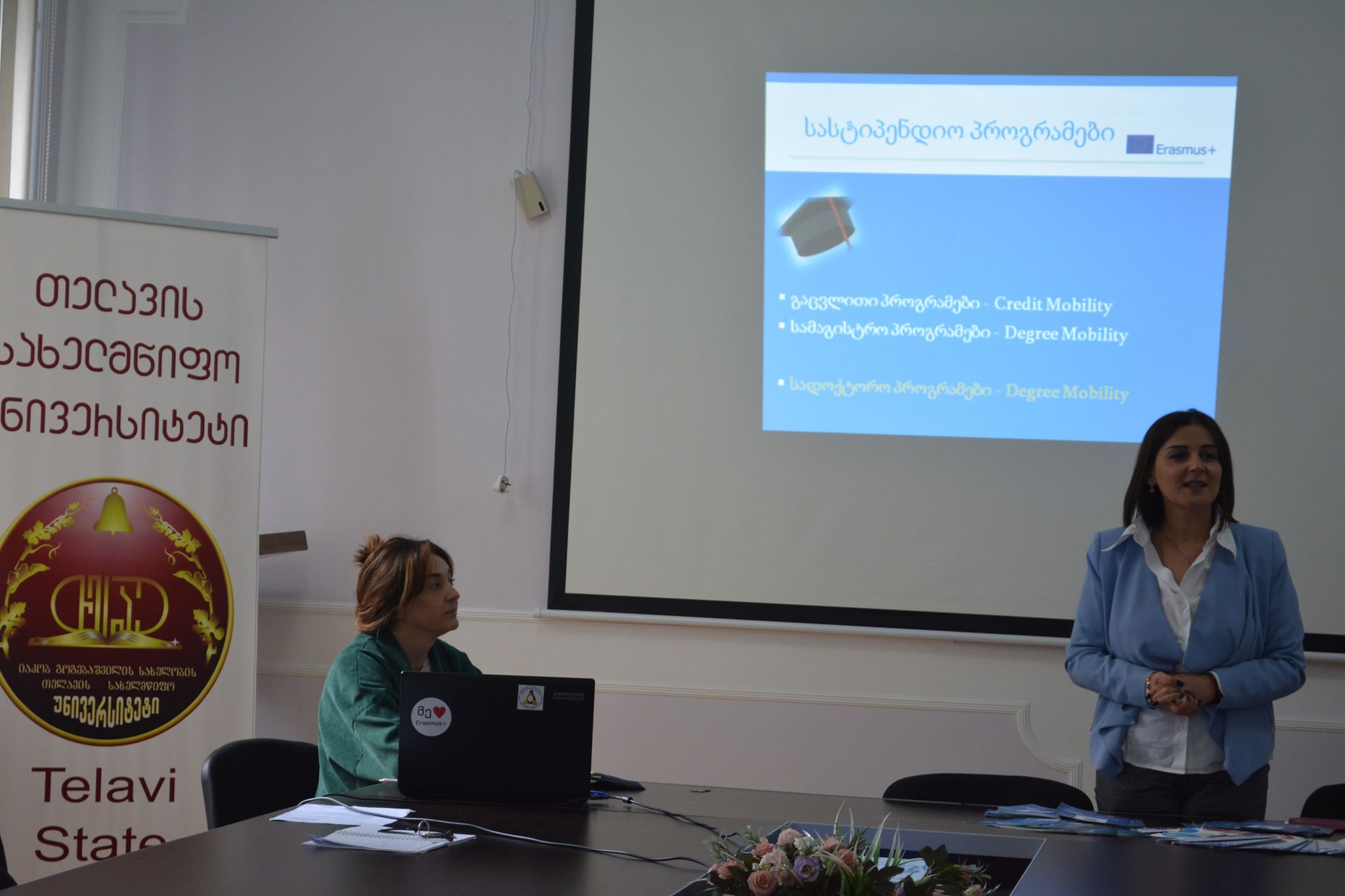 ,,ერასმუს+“-ის  ეროვნული ოფისის წარმომადგენლებმა, თათა ლორთქიფანიძემ  და ნინო ურუშაძემ , 24 ოქტომბერს, იაკობ გოგებაშვილის სახელობის თელავის სახელმწიფო უნივერსიტეტში, ,,ერასმუს+“-ის  ერთობლივი სამაგისტრო პროგრამების ( Degree Mobility) პრზენტაცია გამართეს.