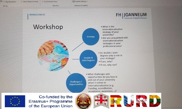 2021 წლის 25-30 მარტს, ევროკომისიის მიერ დაფინანსებული პროექტის (RURD) ფარგლებში, ავრსტიის FH Joanneum განმოყენებითი მეცნიერების უნივერისტეტმა პროექტის საქართველოს პარტნიორი უნივერსიტეტებისთვის, უნივერსიტეტების ინტერნაციონალიზაციის სტრატეგიის განვითარების შესახებ ტრენინგი გამართა. ტრენინგის თემები იყო: უნივერსიტეტების ინტერნაციონალიზაცია, რეგიონის სტრატეგიის განვითარება რეგიონის უნივერსიტეტების პერსპექტრივიდან, უნივერსიტეტის სტრატეგიის განხორციელების პროცესი თავისი მონიოტირინგით და უნივერსიტეტის ეკოსისტემა.