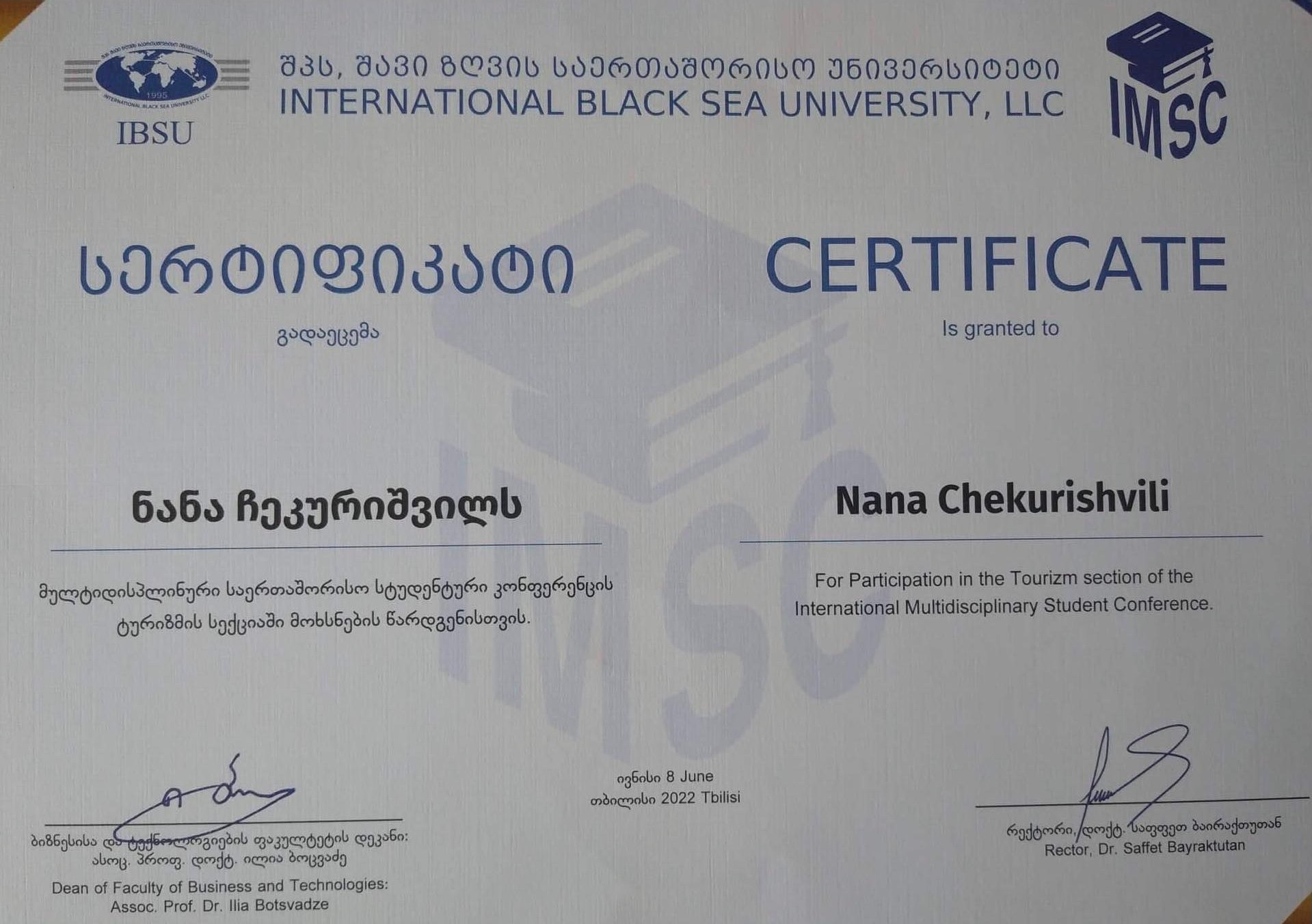ნანა ჩეკურიშვილის მიერ წარმოდგენილი მოხსენება კონფერენციის კომისიის მიერ მიჩნეულ იქნა საუკეთესო ნაშრომად და ის შავი ზღვის საერთაშორისო უნივერსიტეტის საკონფერენციო კრებულში დაიბეჭდება. კონფერენციის მონაწილეებს სერტიფიკატები გადაეცათ.