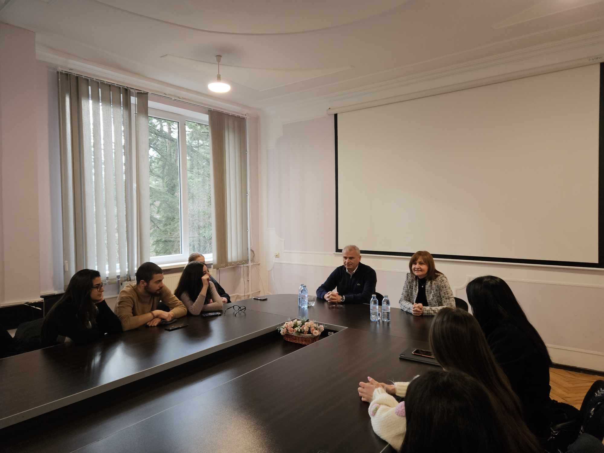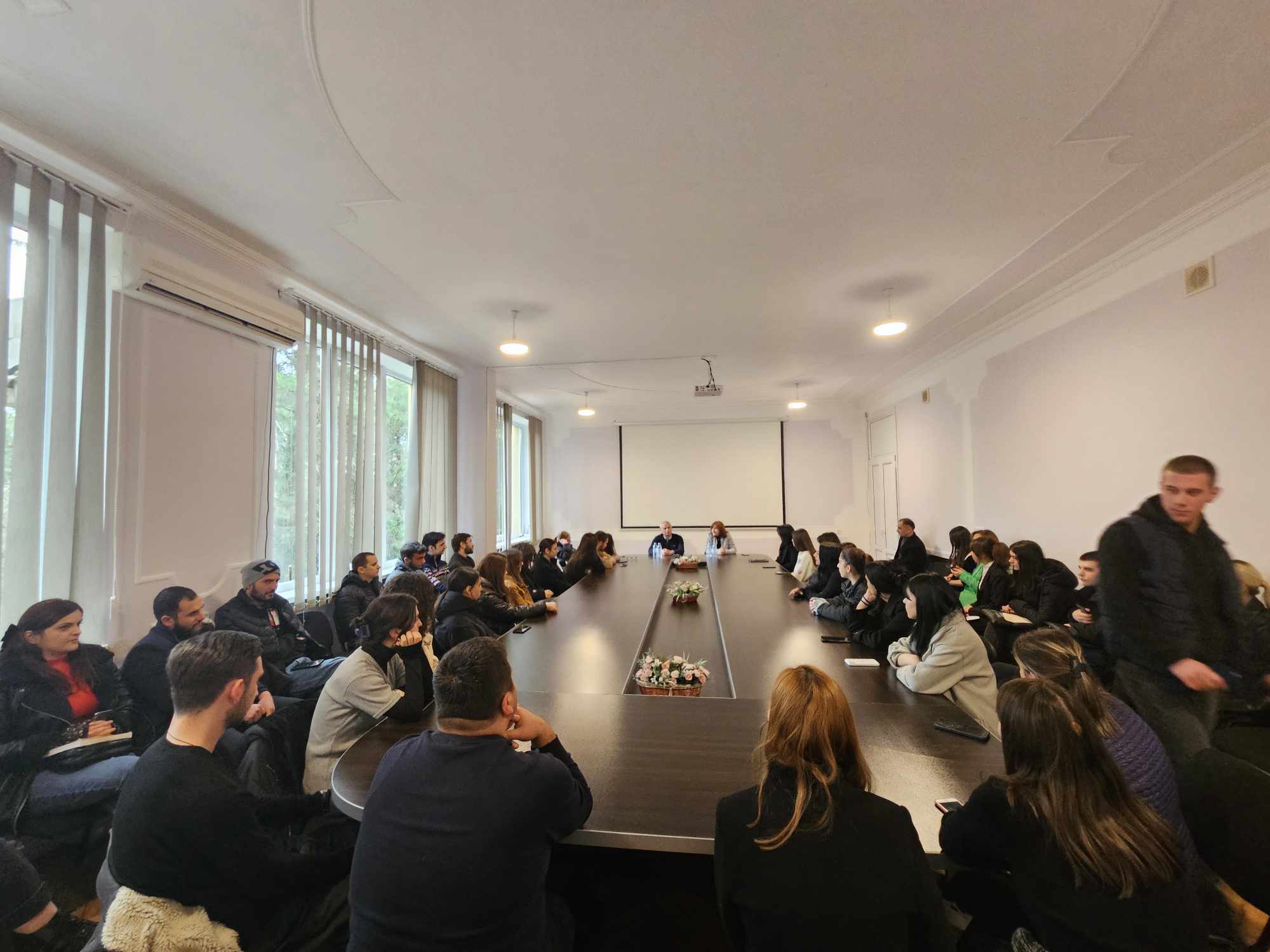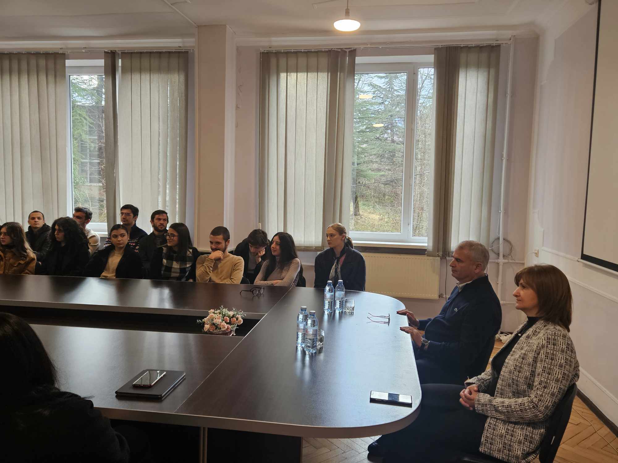 ირაკლი ქადაგიშვილი სხვადასხვა ფაკულტეტის სტუდენტებს ევროინტეგრაციის პროცესში, კერძოდ, ევროკავშირის წევრობის კანდიდატი ქვეყნის სტატუსის მინიჭების პროცესში გაწეული სამუშაოსა და სამომავლო გეგმების შესახებ ესაუბრა.