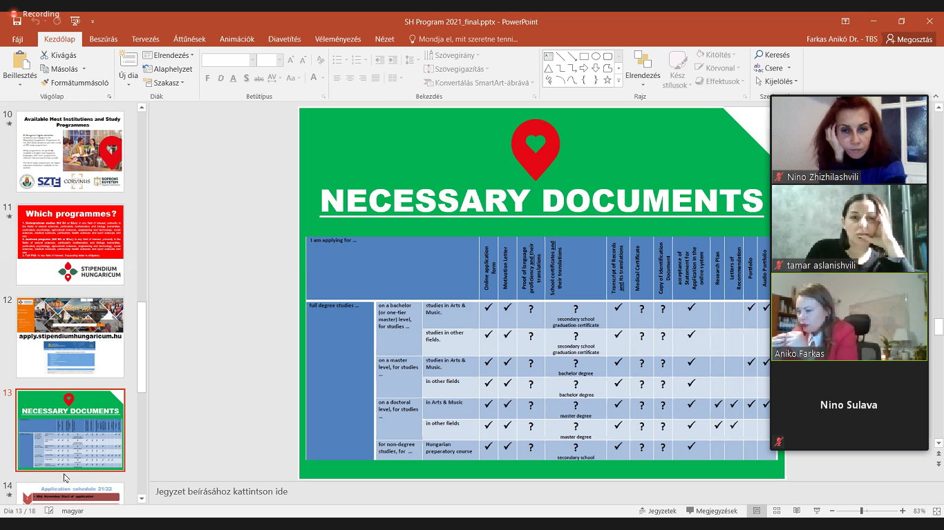 შეხვედრას  საქართველოში უნგრეთის ელჩის მოადგილე ანიკო ფარკაში უძღვებოდა, რომელიც   განათლების საერთაშორისო  ცენტრის პარტნიორი უნივერსიტეტების წარმომადგენლებს შეხვდა და  სასტიპენდიო  პროგრამასთან დაკავშირებულ  საკითხებზე,   სააპლიკაციო პროცესზე, უნგრეთის უნივერსიტეტების არჩევისა და აპლიკაციის წარდგენის ბოლო ვადების შესახებ ესაუბრა.