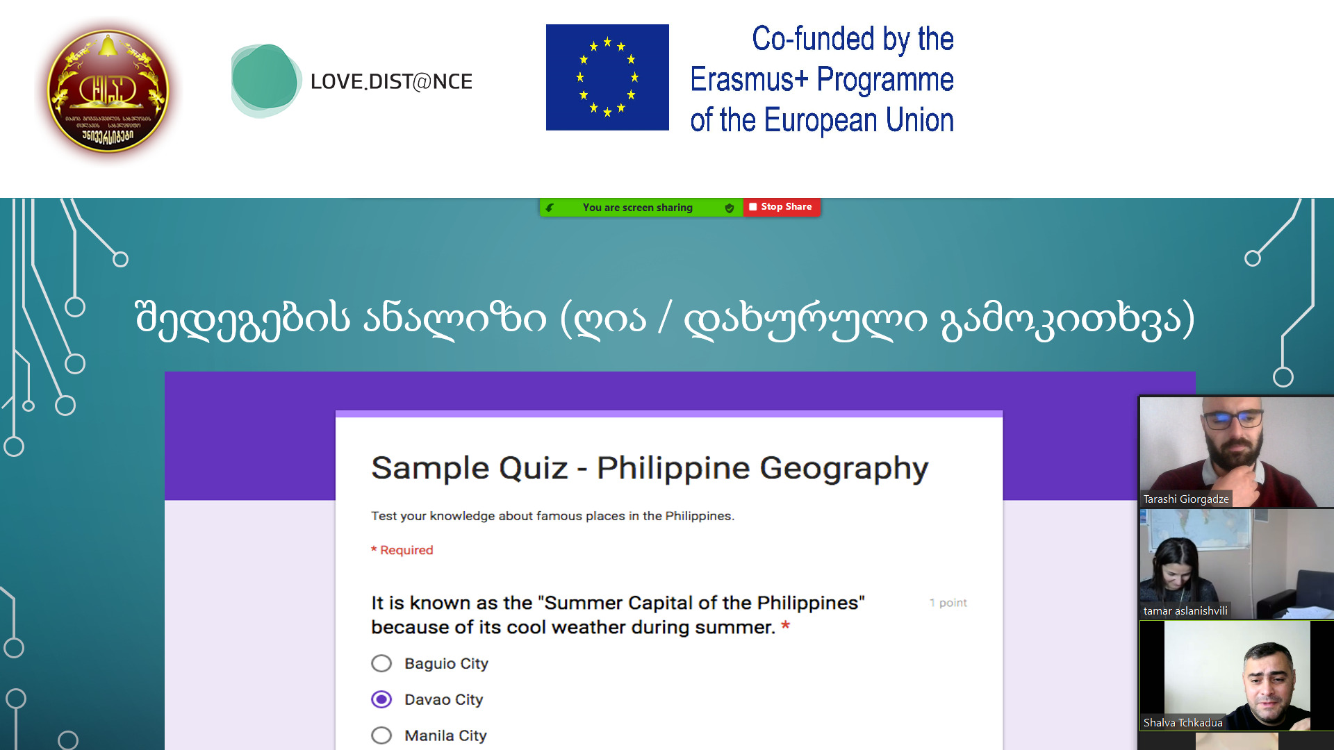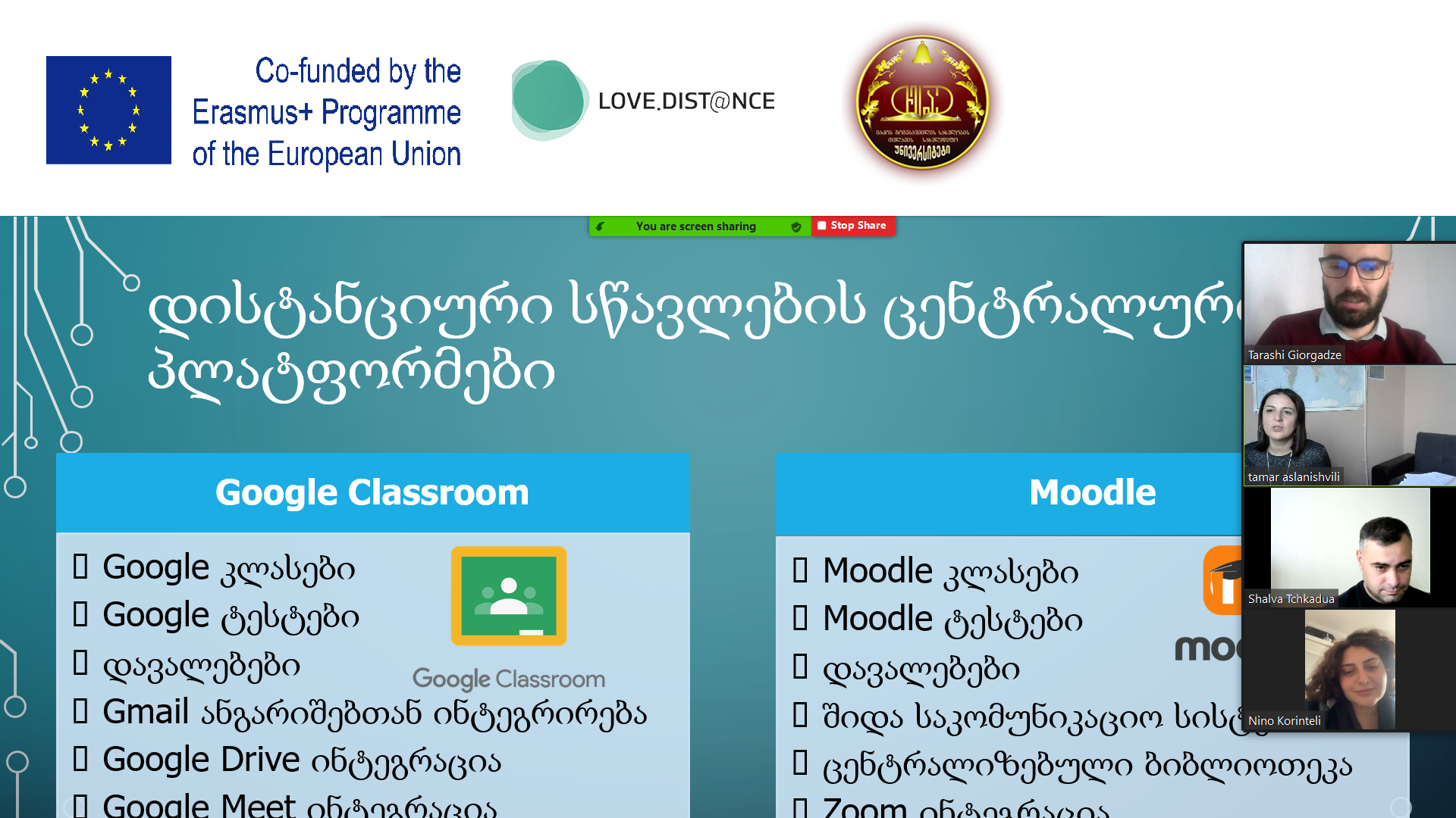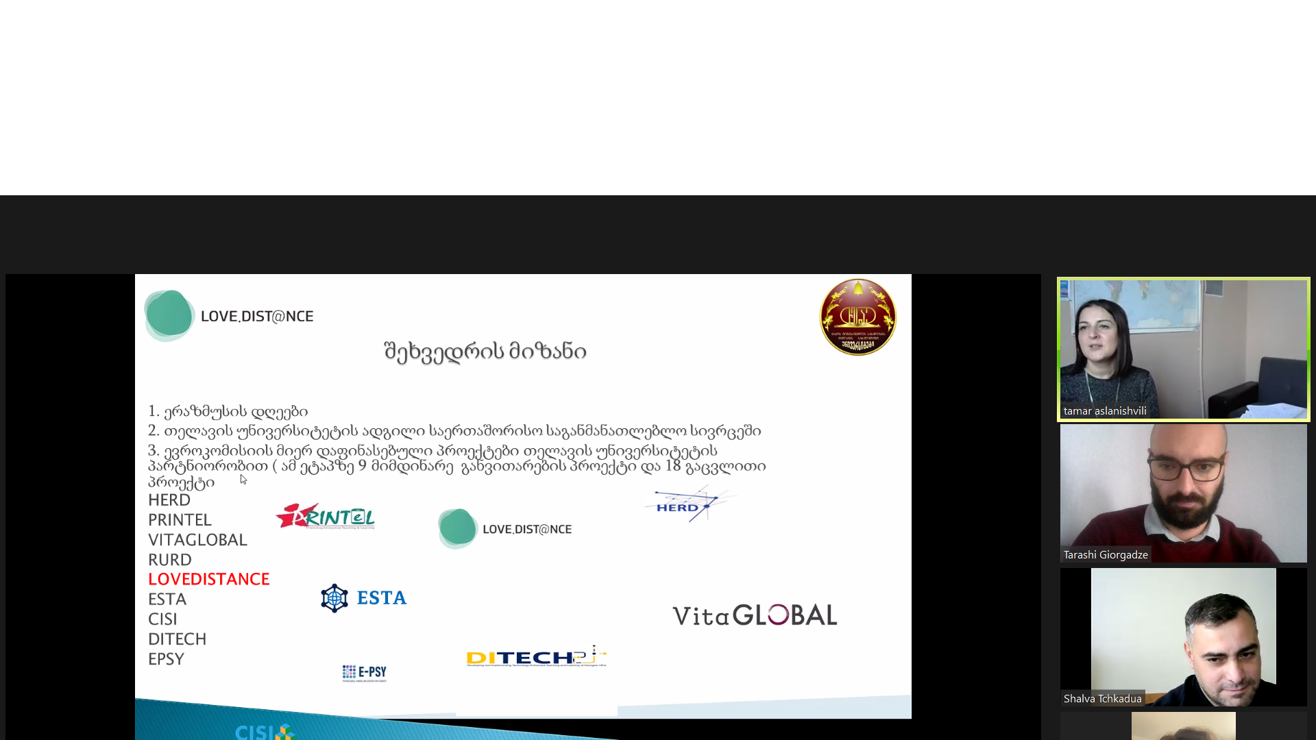 პროექტის წევრებმა დამსწრე საზოგადოებას  უნივერსიტეტში მიმდინარე განვითარების პროექტები გააცნეს. გამორჩეულად იქნა განხილული, ერთ-ერთი მიმდინარე პროექტის, LOVEDISTANCE-ის ფარგლებში მომზადებული  საპილოტე კურსების ტექნიკური მახასიათებლები და მეთოდოლოგიური ასპექტები. შეხვედრა კითხვა-პასუხის რეჟიმში გაგრძელდა.