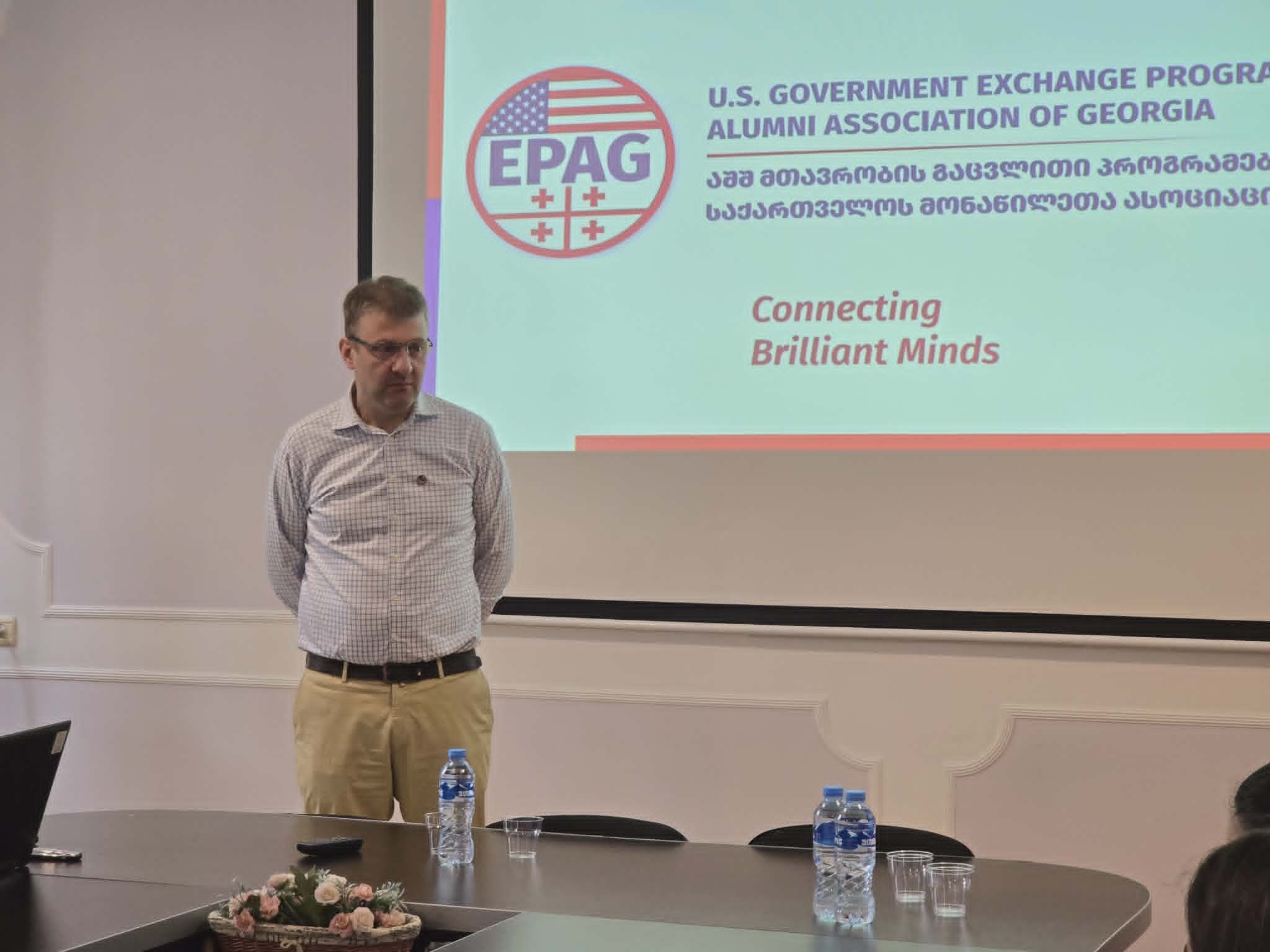 შეხვედრის სპიკერები იყვნენ PhD, MPA ჩრდილოეთ ტეხასის უნივერსიტეტის სერტიფიცირებული ტრენერი საუნივერსიტეტო სწავლების მიმართულებით, ნოუ ჰაუ ტრენინგ ცენტრის დამფუძნებელი, EPAG-ის აღმასრულებელი საბჭოს წევრი დავით დარსაველიძე და MBA, ლონდონის ბიზნეს სკოლა, BNB Bank-ის სამეთვალყურეო საბჭოს წევრი, EPAG-ის აღმასრულებელი საბჭოს წევრი გიორგი არველაძე.